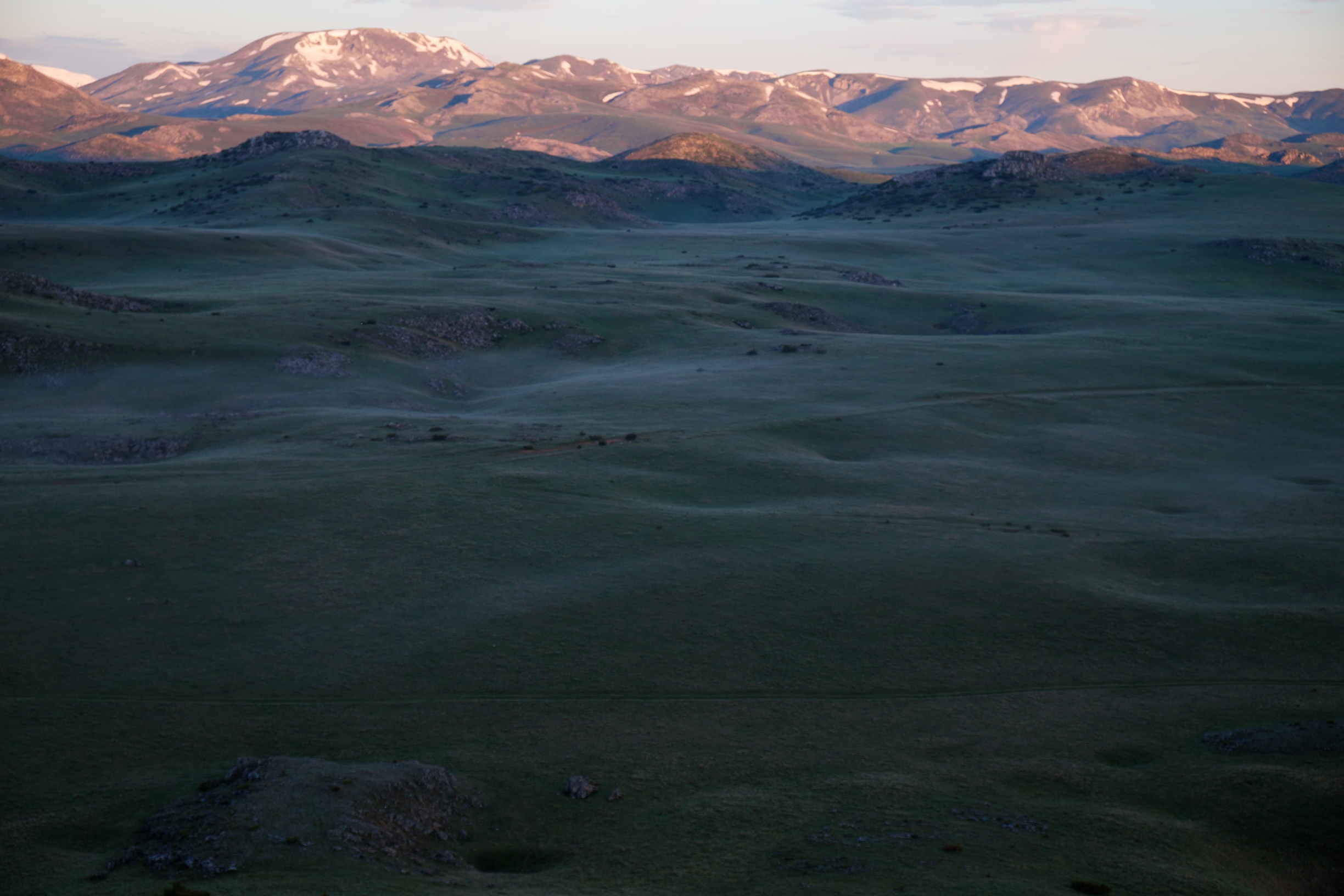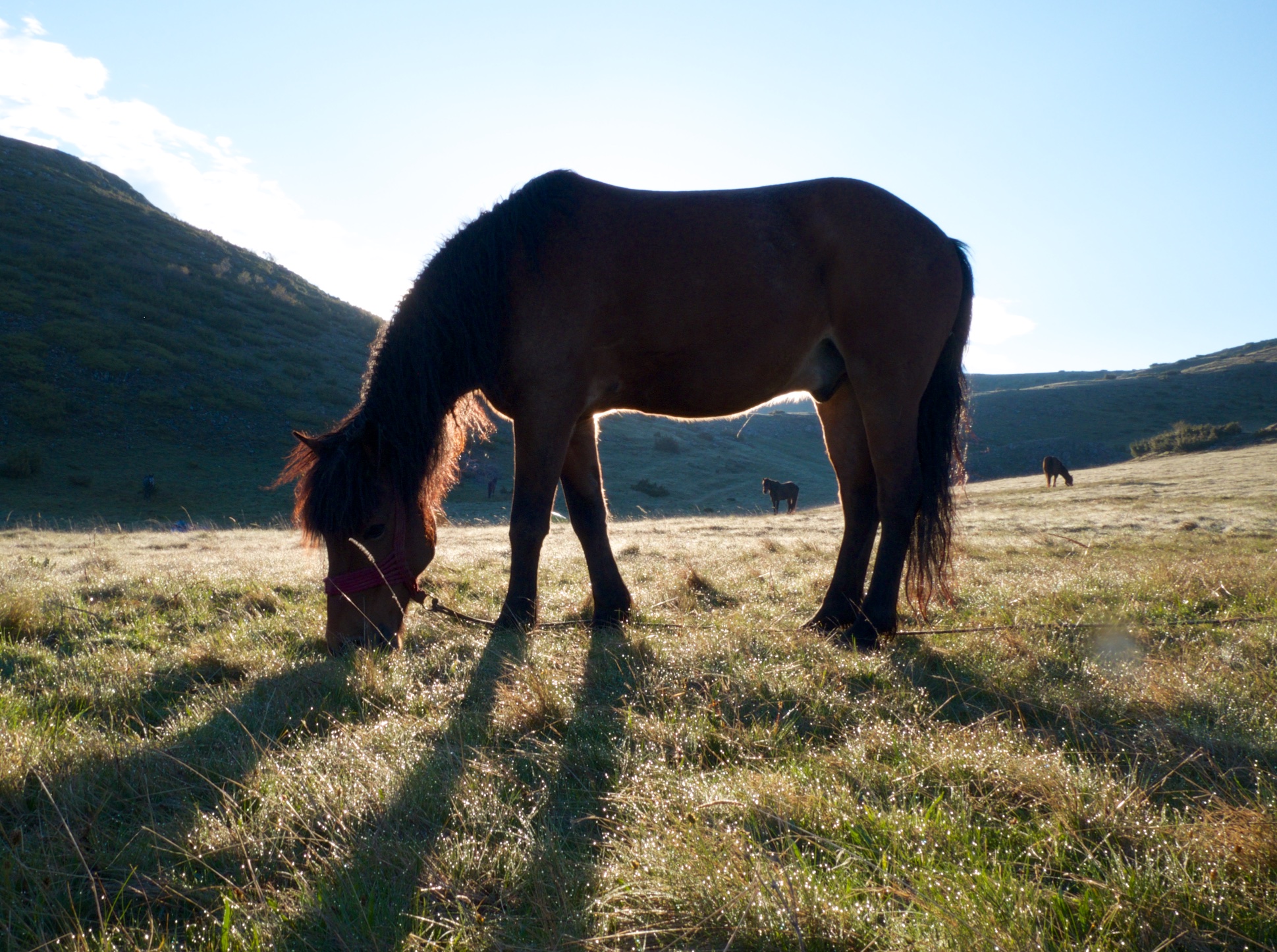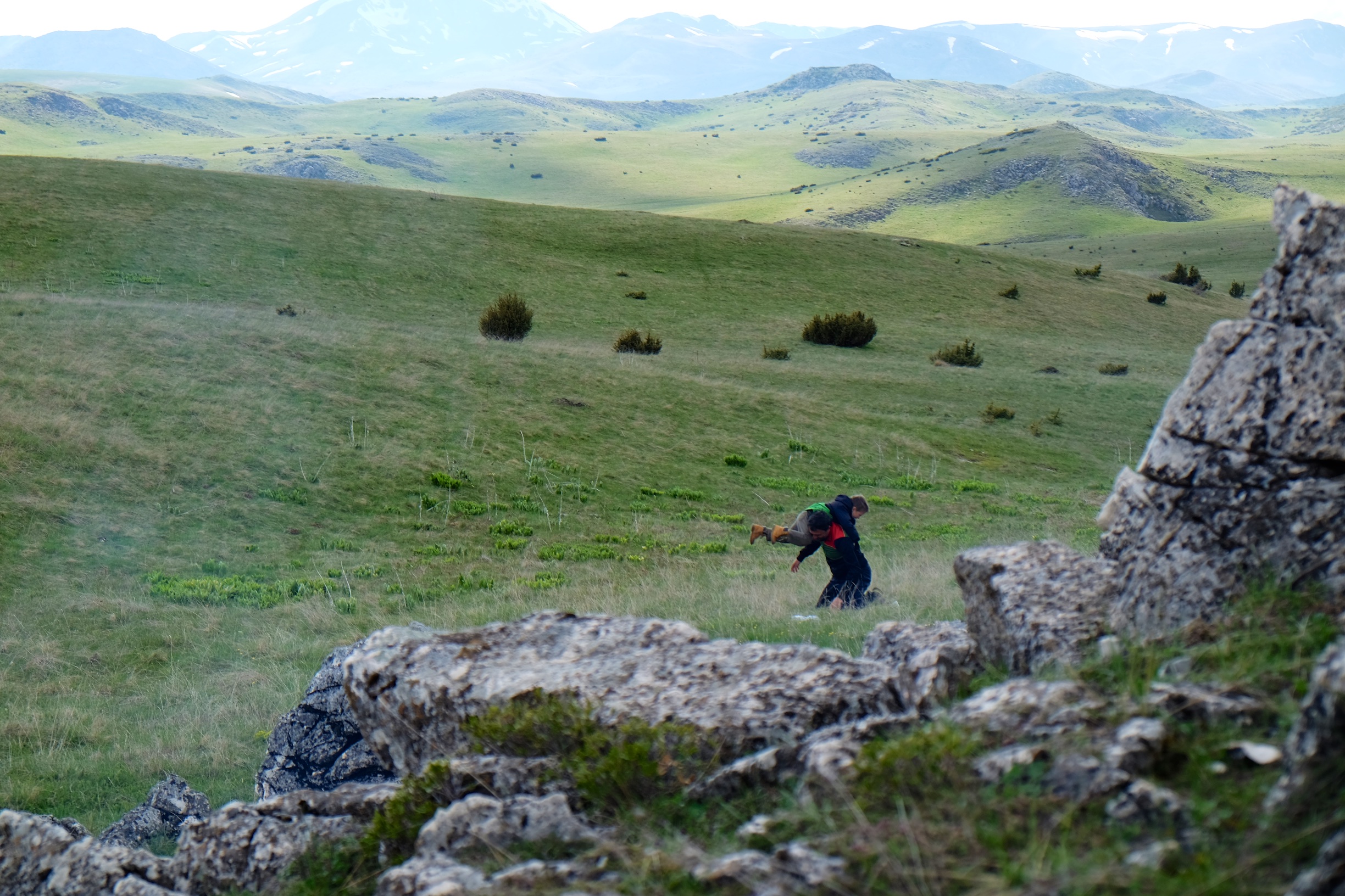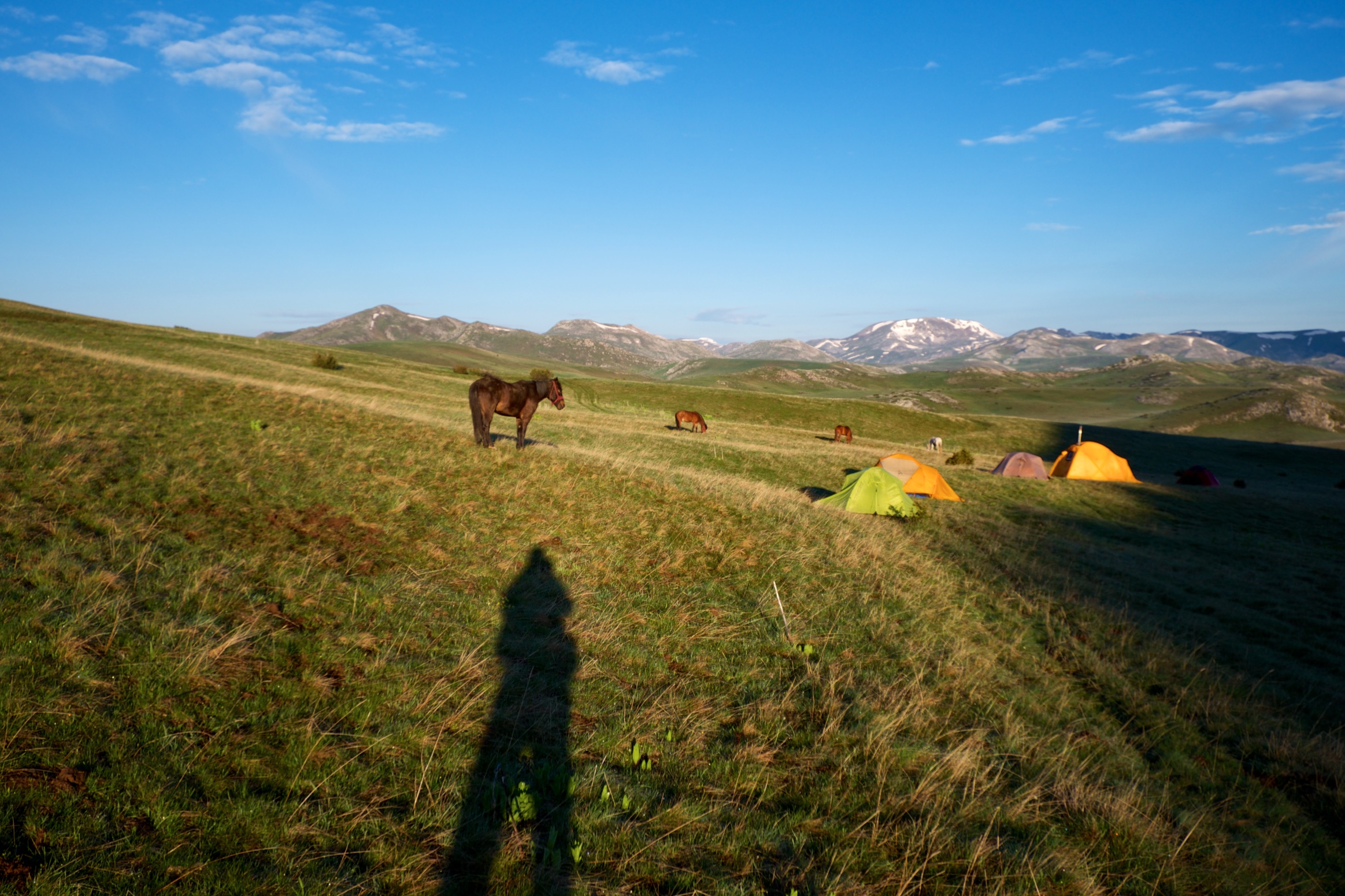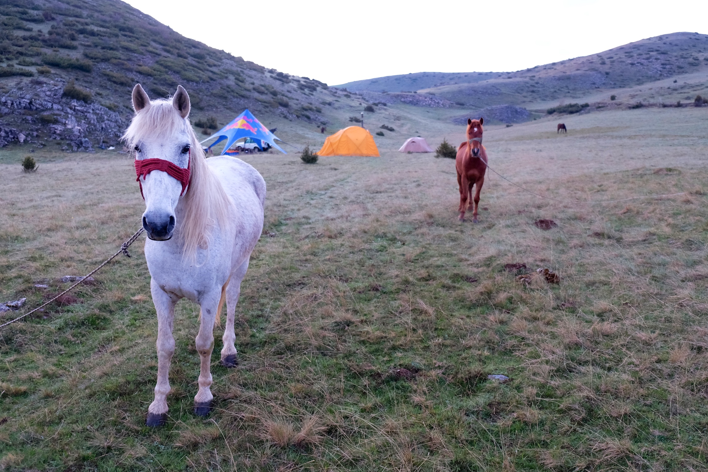 Zurück in den Sattel, man hofft auf den Gewöhnungseffekt, sonst werden sich die sieben Stunden am zweiten Tag wohl noch viel länger anfühlen. Und tatsächlich: Es geht schon besser, man fängt an, die neue Art der Fortbewegung zu genießen. Zuerst reiten wir durch Wald bergauf, schließlich die Baumgrenze, dann plötzlich: Unendliche Weiten, schneebedeckte Berge grasige Hochebenen. „Willkommen im schönsten Teil Mazedoniens“, schreit Vasko von vorne zurück und setzt zum ersten Galopp des Tages an.