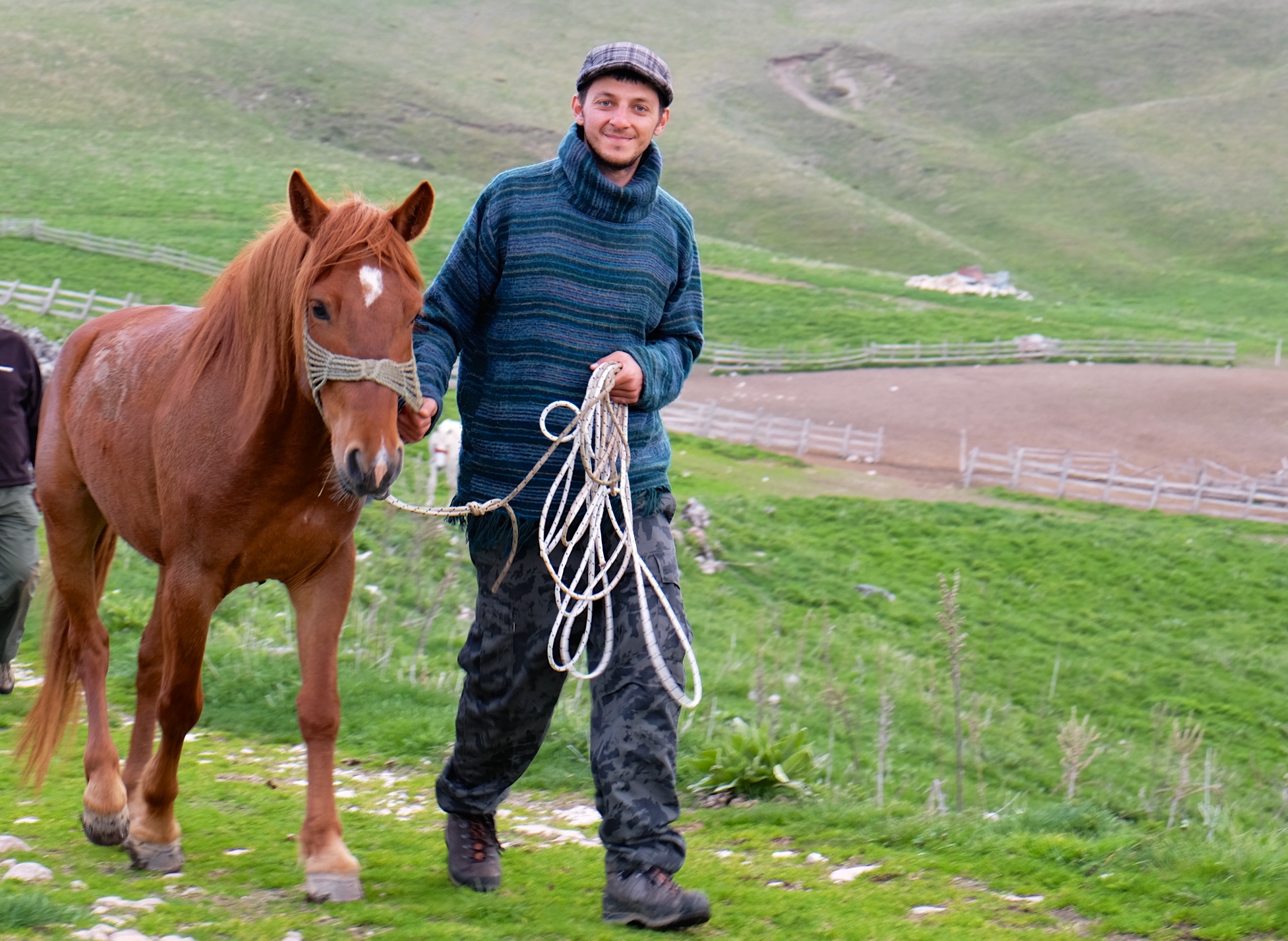 Und der Mann mit Vollbart, der heißt Vasko. Wären wir nicht gerade in Mazedonien, man würde ihn einen Cowboy rufen. Er ist einer, der auf dem Pferd sitzt, als hätte er nie etwas anderes getan. Hat er auch fast nicht, könnte man behaupten, Vasko wuchs quasi auf dem Pferd auf, im kleinen Bergdorf Galičnik auf 1.500 Metern. Hier oben wird seit jeher, und auch heute noch, das Pferd für feierliche Hochzeitsfestivitäten und weniger feierliche Holzarbeit eingesetzt. Es war aber erst im fernen Ausland, bei einer Kanada-Reise, dass das für ihn Selbstverständliche in ein neues Licht rückte: „Ich war dort 14 Tage mit einer geführten Reitgruppe unterwegs, und hinterher dachte ich: Hey, das wäre doch die beste Möglichkeit, Besuchern mein eigenes Land näherzubringen – von einem Pferderücken aus. Die Pferde waren ja immerhin schon da, die mussten eigentlich nur noch gesattelt werden“. Seine lobenswerte Mission dabei: „Die Leute wieder mit der Natur in Einklang bringen“.