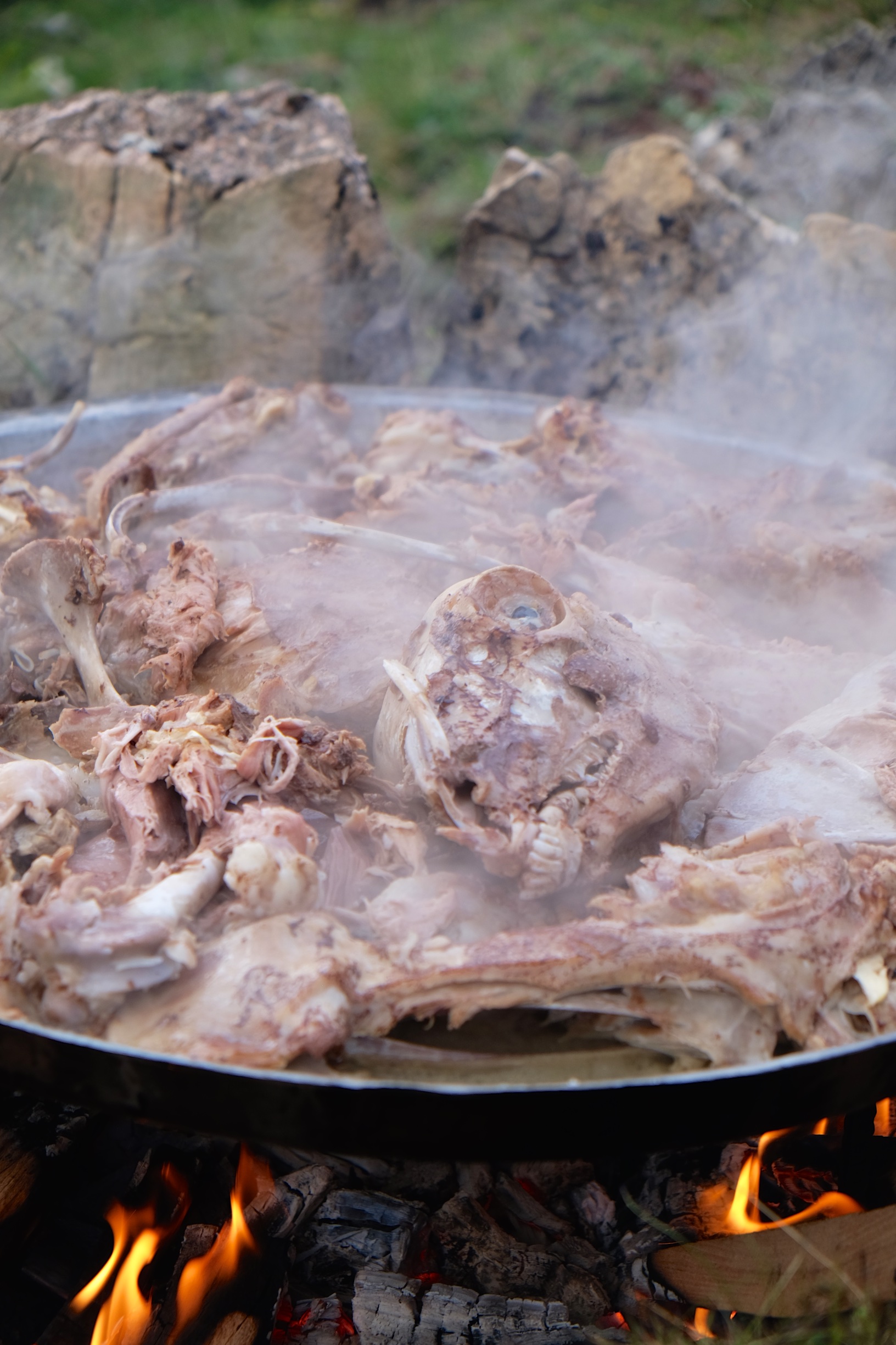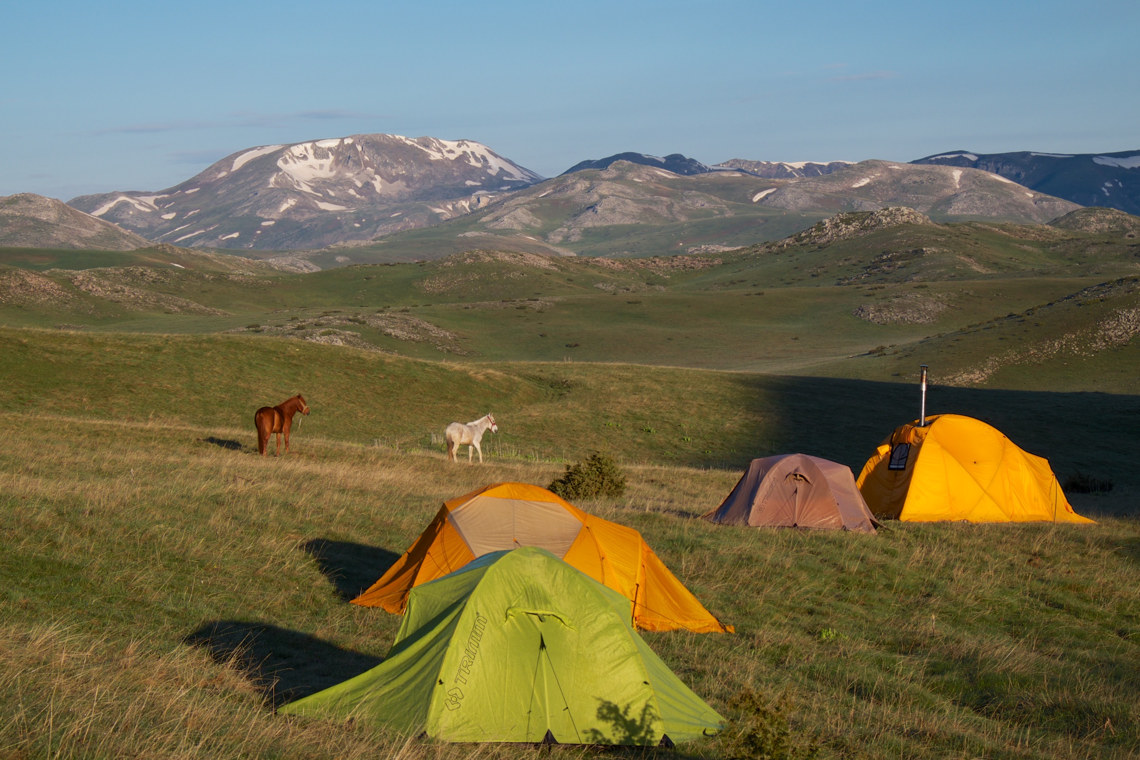 Noch mehr zum Glück: die zweite Nacht werden wir im Hochlager verbringen, Zelt und Lagerfeuer, so wie sich das für echte Cowboys eben gehört. Am Menüplan: Lamm, the traditional macedonean way. Und wieder Rakija, der traditionelle Obstbrand, der gehört sowieso immer und zu allem dazu. So sitzen wir also am Lagerfeuer, singen mazedonische Volkslieder, essen mazedonisches Lamm, trinken mazedonischen Rakija. Daneben turnt Tan, der Fünfjährige, über ein paar Felsen, quiekt vergnügt und ist noch fitter als so mancher Erwachsene unter uns. „Unglaublich, wie sich seine Persönlichkeit in so kurzer Zeit verändert hat“, kommentiert Tomislav, der Vater. „Er spielt den ganzen Tag und beschwert sich über rein gar nichts.“