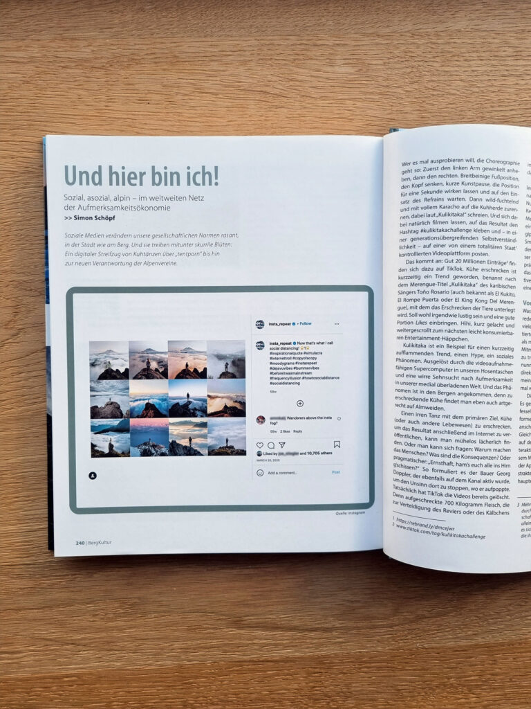 (A)soziale Medien verändern unsere gesellschaftlichen Normen rasant, in der Stadt wie am Berg. Und treiben mitunter skurrile Blüten: Ein digitaler Streifzug von Kühtänzen über tentporn bis hin zur neuen Verantwortung der Alpenvereine.