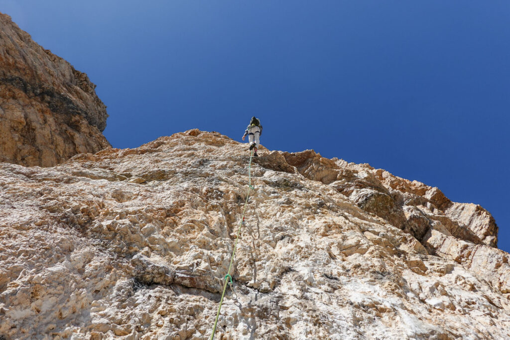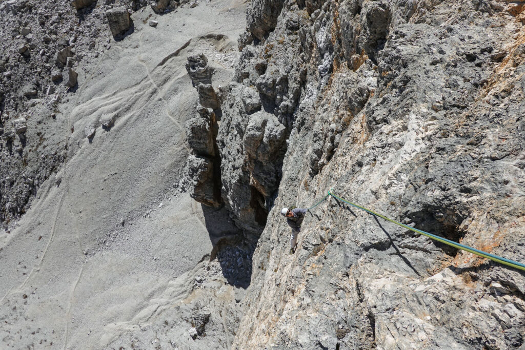 - Der obere Teil nach der Schlüssellänge wird deutlich bröseliger, hier ist alpines Feingefühl gefragt. Auch die Linienführung wird, nun ja, etwas unlogisch, man quert zum Schluss ein großes Schotterband und die letzte 6er Länge ist mehr ein Balancieren auf Schotter als Kletterei. Sollte man nur machen, wenn man das geniale Panorama am Gipfel will oder zu Fuß absteigt.