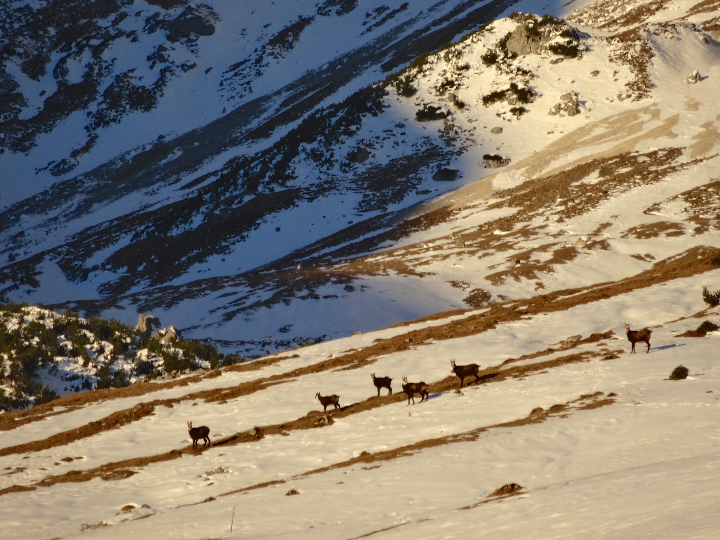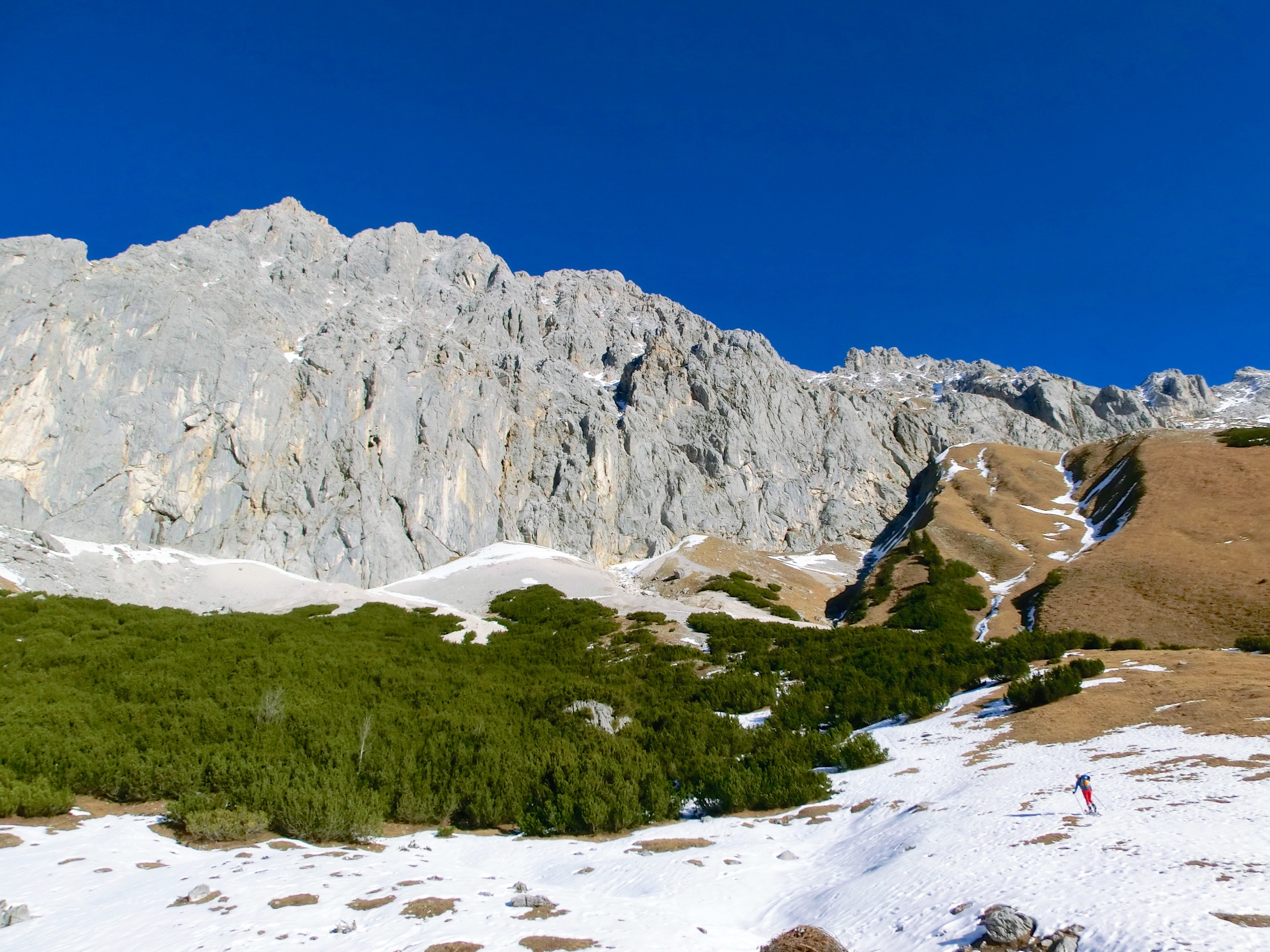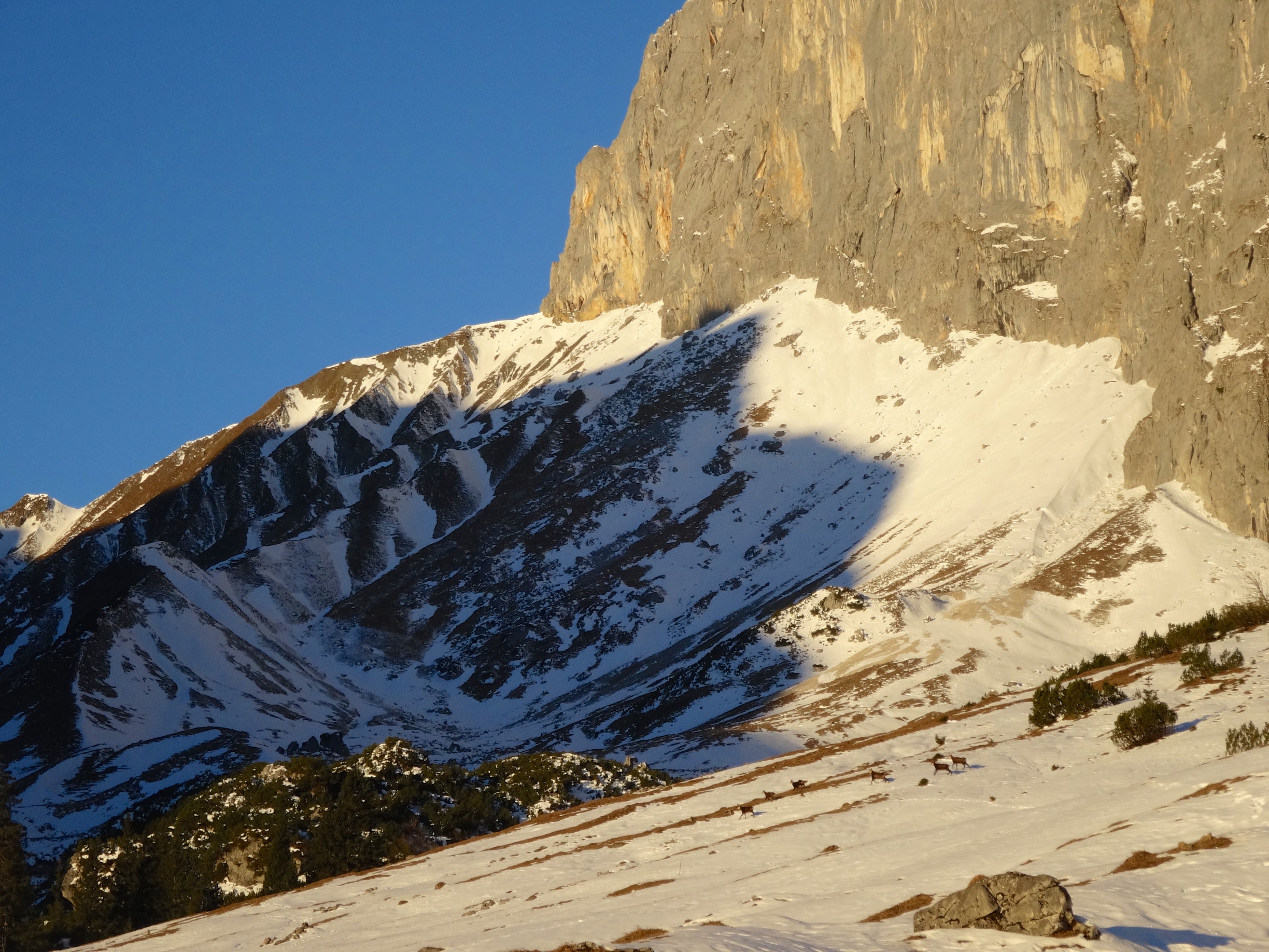 Another project, long on the list: Skitour -> climb -> ski. Finally made possible this year on the south faces of the Plattenspitzen, touring up from Ehrwald. A (to me) new and beautiful area with lots of base climbs as well. The route we chose, Das Schweigen der Hämmer, well lets say that the 5c’s are definitely 6b’s and the 6c+ is … hard. Very fragile slab climbing on mini-holds, and as this was December as well, we repelled after pitch 5 for the day was deciding to end, slowly.
