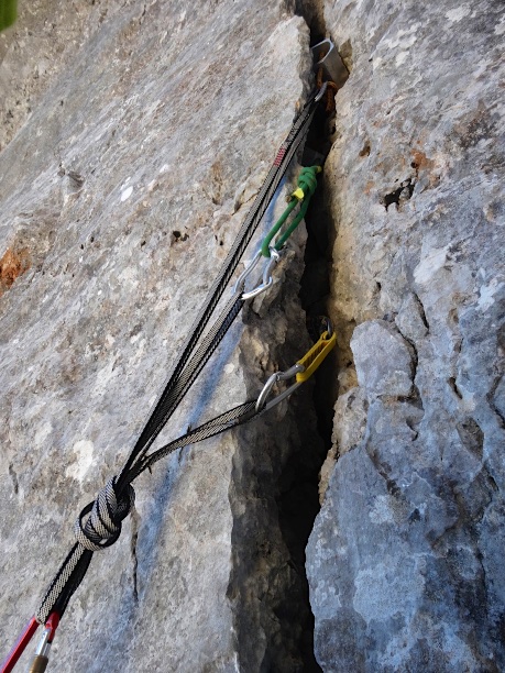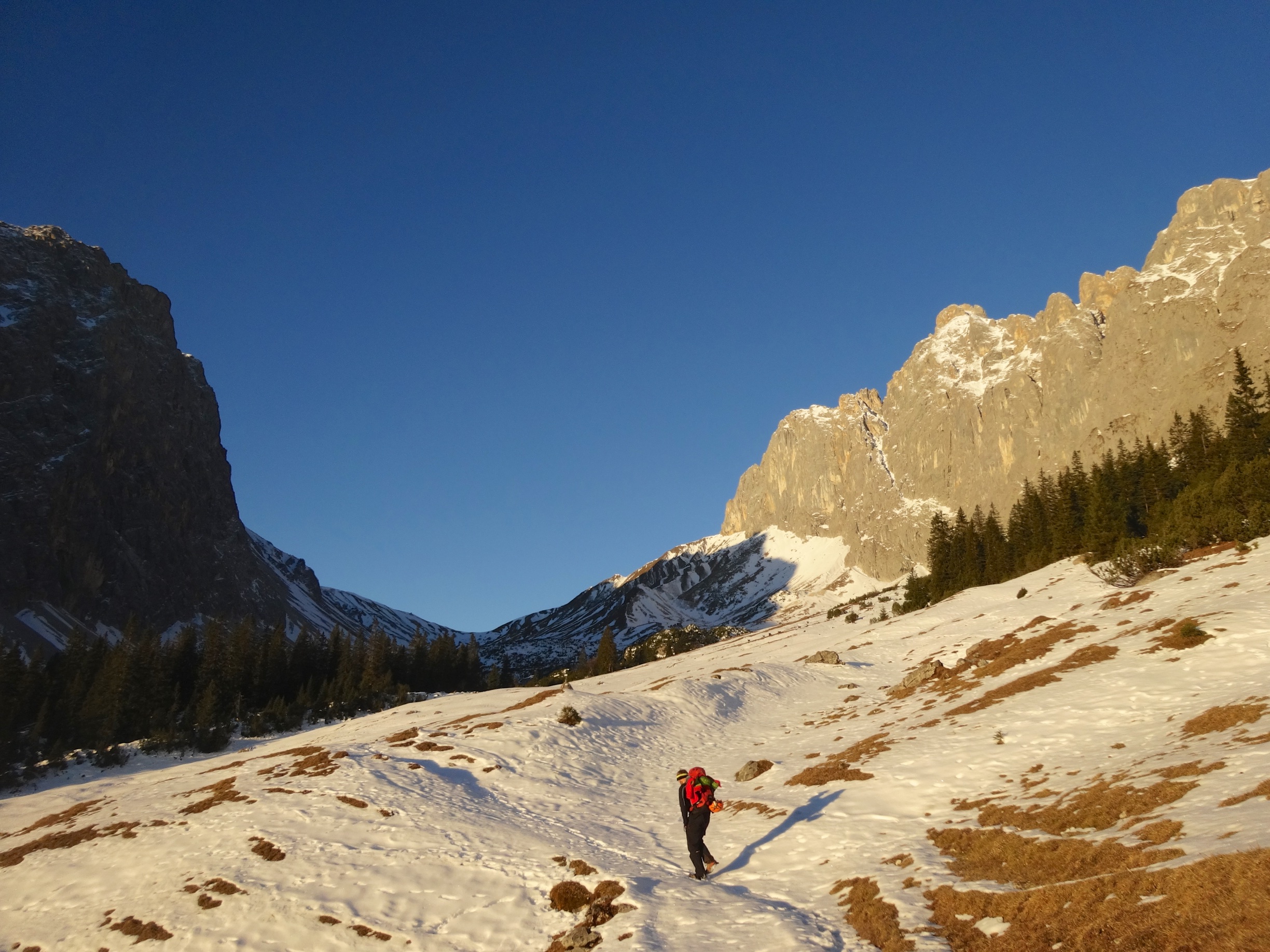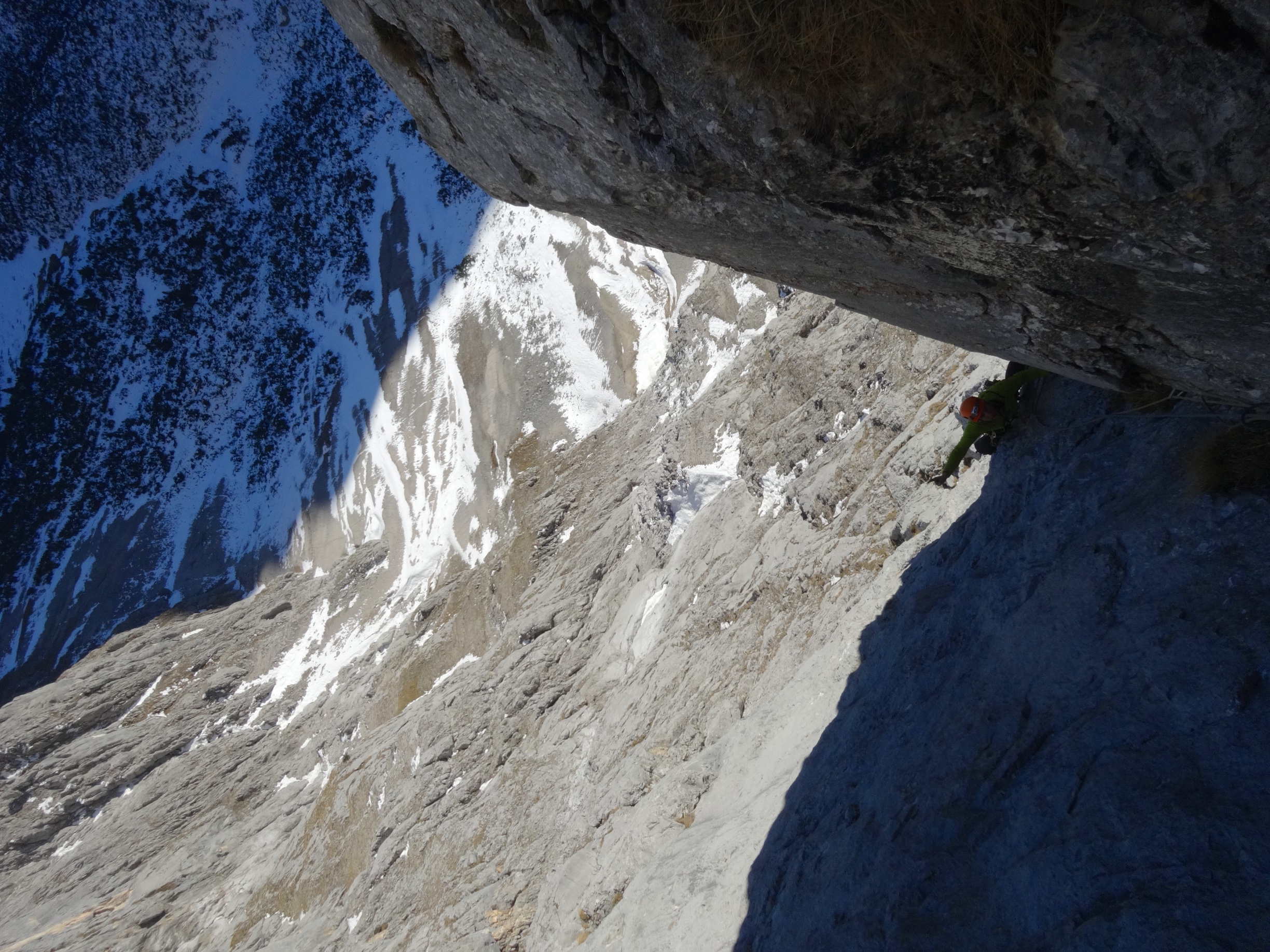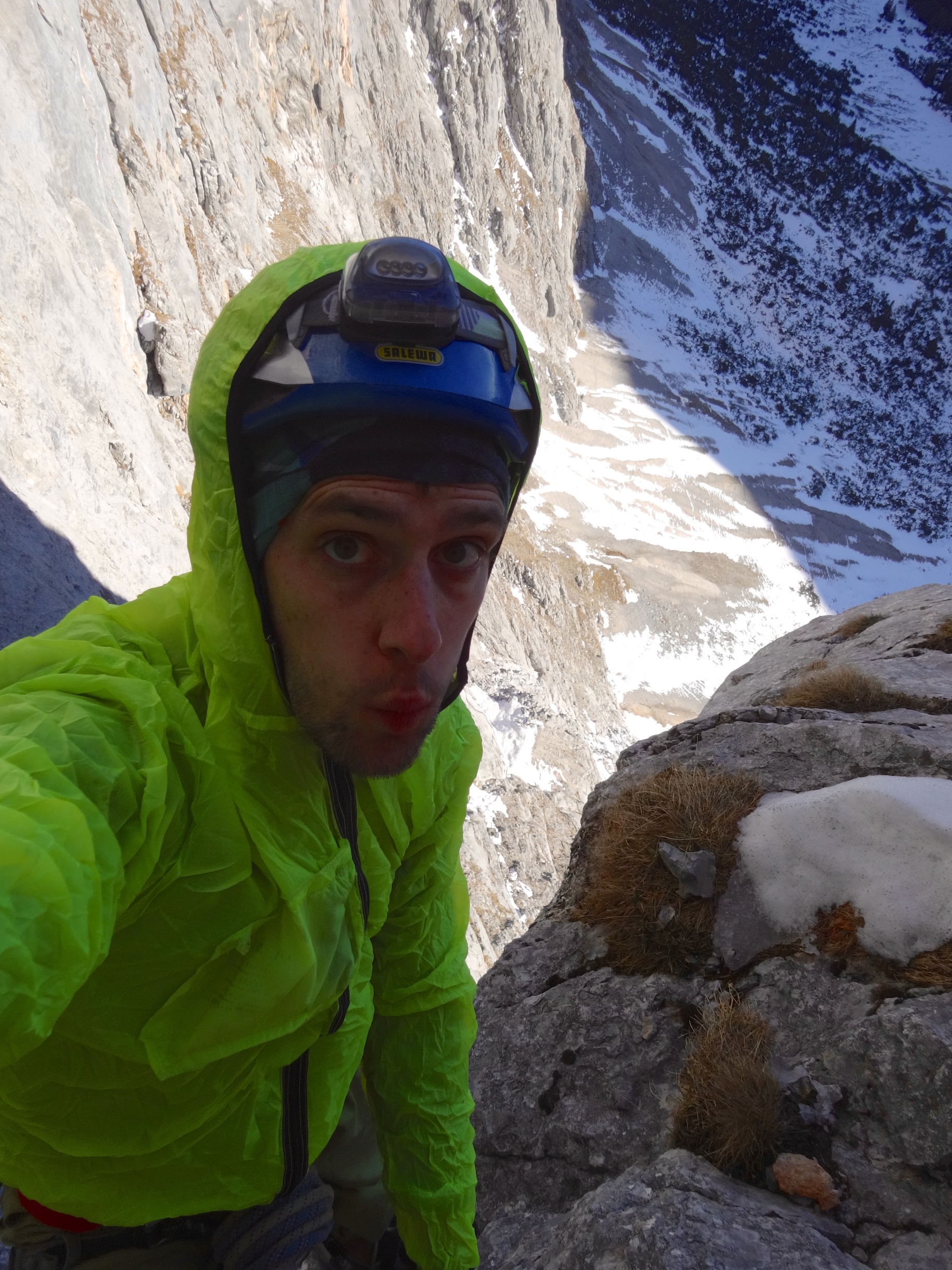 Alex: „Let’s do something really alpine.“ Me: „Well, alright.“ Yea, almost the famous last words. We can now quite confidently claim that this route did not see many repeats in the last 37 years. First ascent: 1978, graded 6+, one of the test-peaces of free climbing. Normally, this grade is an easy warm-up for us, but up here, it proved to be our very limit. Mentally and physically. The first crux is to actually get to the start of the route („100 m Schrofen“ my ass), about 200 m of free soloing through questionable terrain you finally reach the route, and it proves to be all but easy. Almost without fixed protection, besides a (very) few rusty pitons and slings, the climbing took a lot longer than we thought, and it was a lot harder than we thought; finishing off with a 6- offwidth crack; never been so thankful for seconding a pitch! Well, and then this was of course in December, and days in December tend to be short. Of course, getting down that thing was the second half of this story, and thank the spaghetti monster that we had both headlamps. What followed was a highly sketchy repel / downclimb action on properly aged gear, and let me say that, quite out of my comfort zone. Well: alpine we wanted; alpine we got.