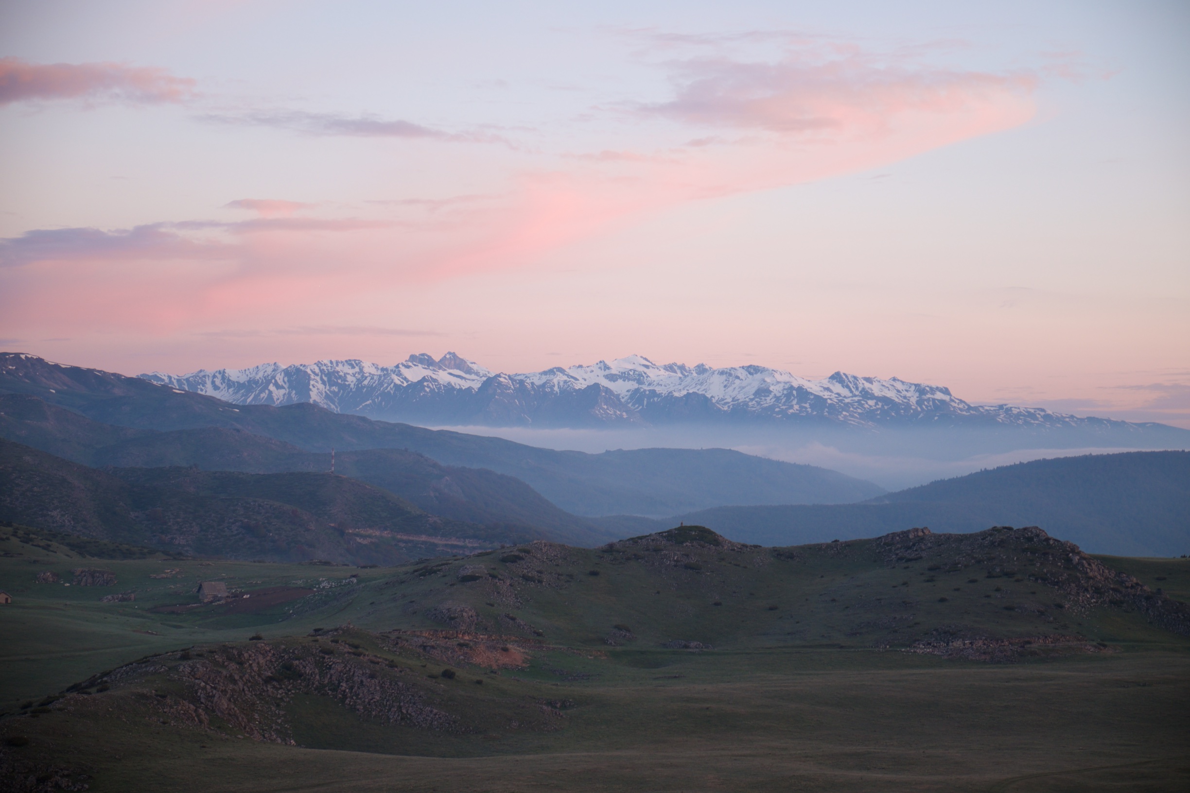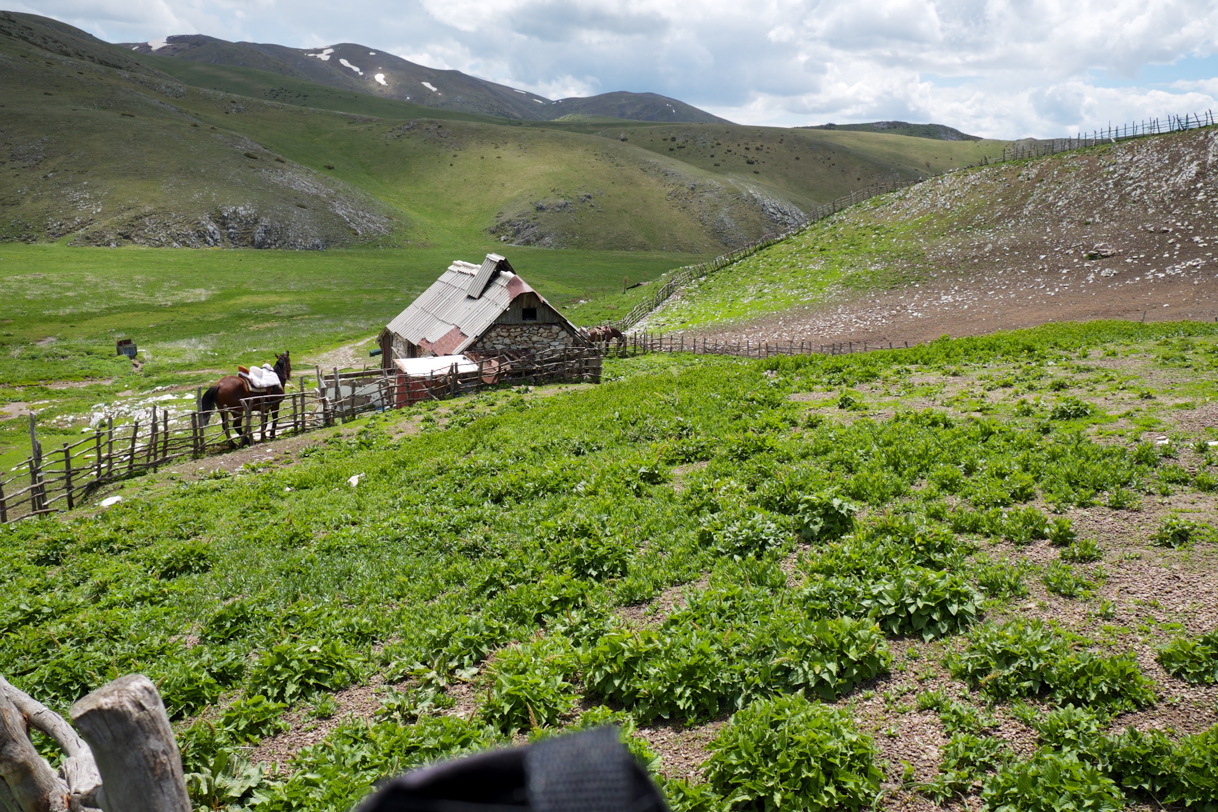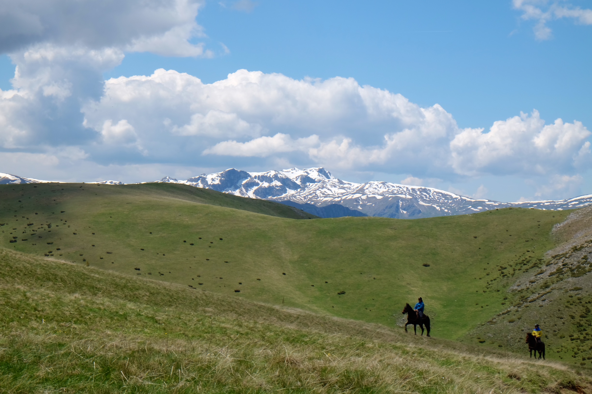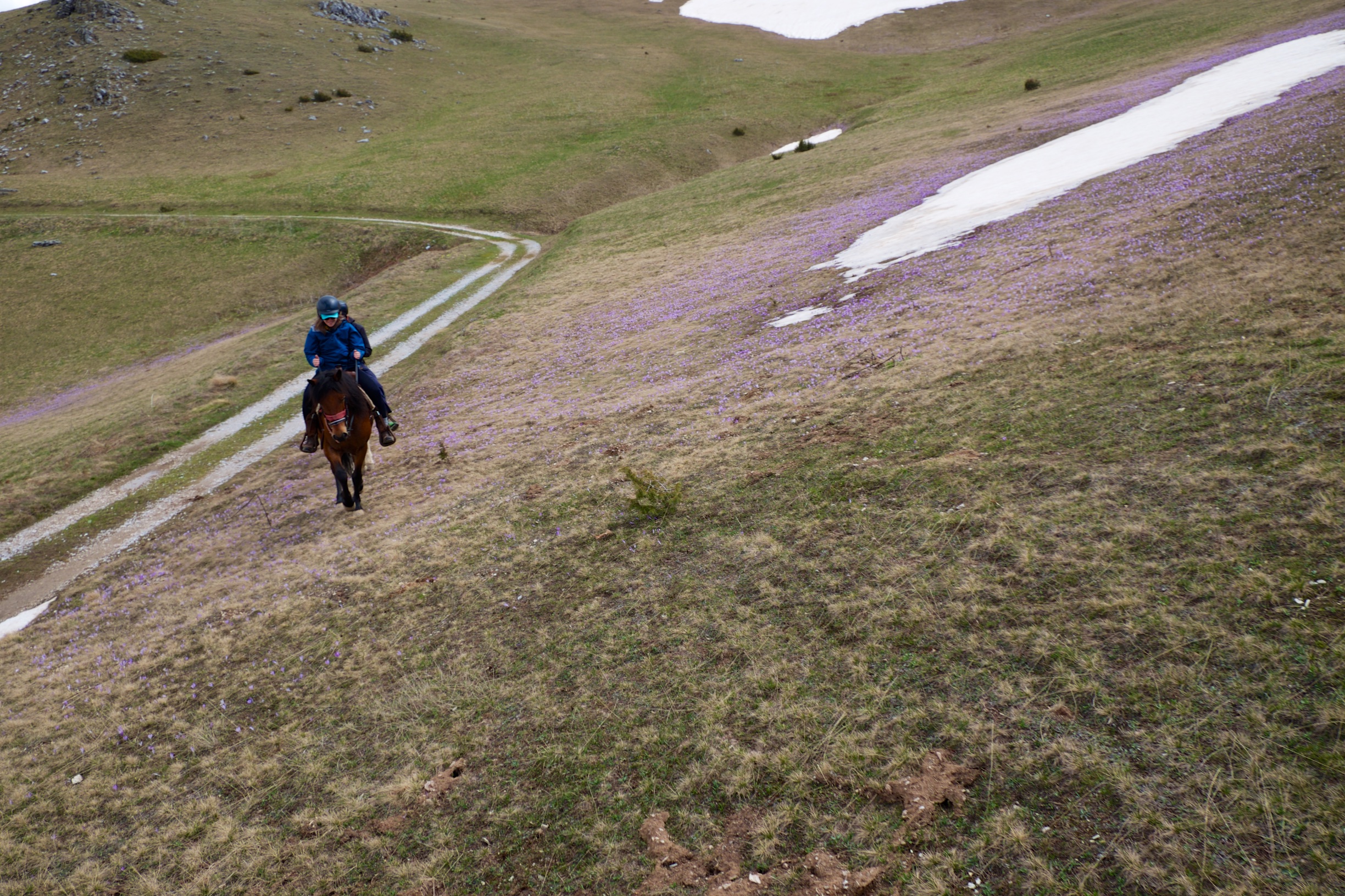 Zurück in den Sattel, man hofft auf den Gewöhnungseffekt, sonst werden sich die sieben Stunden am zweiten Tag wohl noch viel länger anfühlen. Und tatsächlich: Es geht schon besser, man fängt an, die neue Art der Fortbewegung zu genießen. Zuerst reiten wir durch Wald bergauf, schließlich die Baumgrenze, dann plötzlich: Unendliche Weiten, schneebedeckte Berge grasige Hochebenen. „Willkommen im schönsten Teil Mazedoniens“, schreit Vasko von vorne zurück und setzt zum ersten Galopp des Tages an.