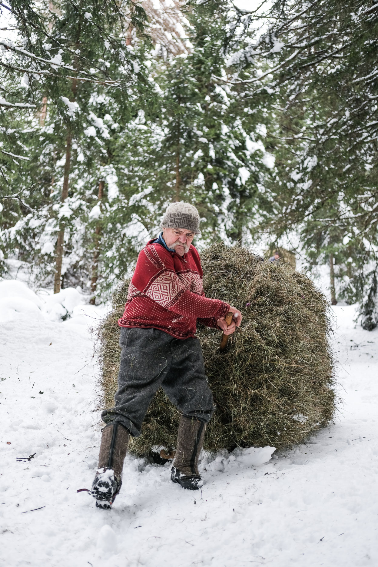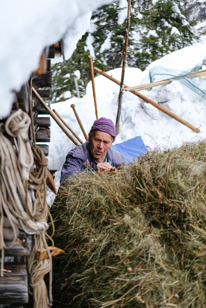 Und schon sind die „Hansens“ die Hälfte des Hangs bergwärts gestapft, durch knietiefen Neuschnee, einen Holzstab in der Hand und dazu ein seltsames Holzgestell geschultert. „A wia die Hennen rennen‘s davon. Nana, die Alten warten einfach nit …“, sagt Helga und schüttelt mit einem Lächeln ihren Kopf. Immerhin Erich erbarmt sich und gibt eine kleine Einschulung: „Des kearscht so über die Schulter …“. Und Erich – buschiger Schnauzer, abgetragener Strickpullover – muss es wissen. Auf die Frage, wie lange er schon Heu zieht, sagt er: „Jo mei, seit a neune, zehne.“ Damit meint er nicht seit neun, zehn Jahren, sondern: Seit er neun oder zehn Jahre alt ist. Heute ist er 72, das macht dann ein gutes Bündel Erfahrung. Erich weiß also genau, wie der „Ferggl“ – dieses seltsame Gestänge, worauf oben am Stadel das Heu geladen wird – richtig geschultert werden muss.